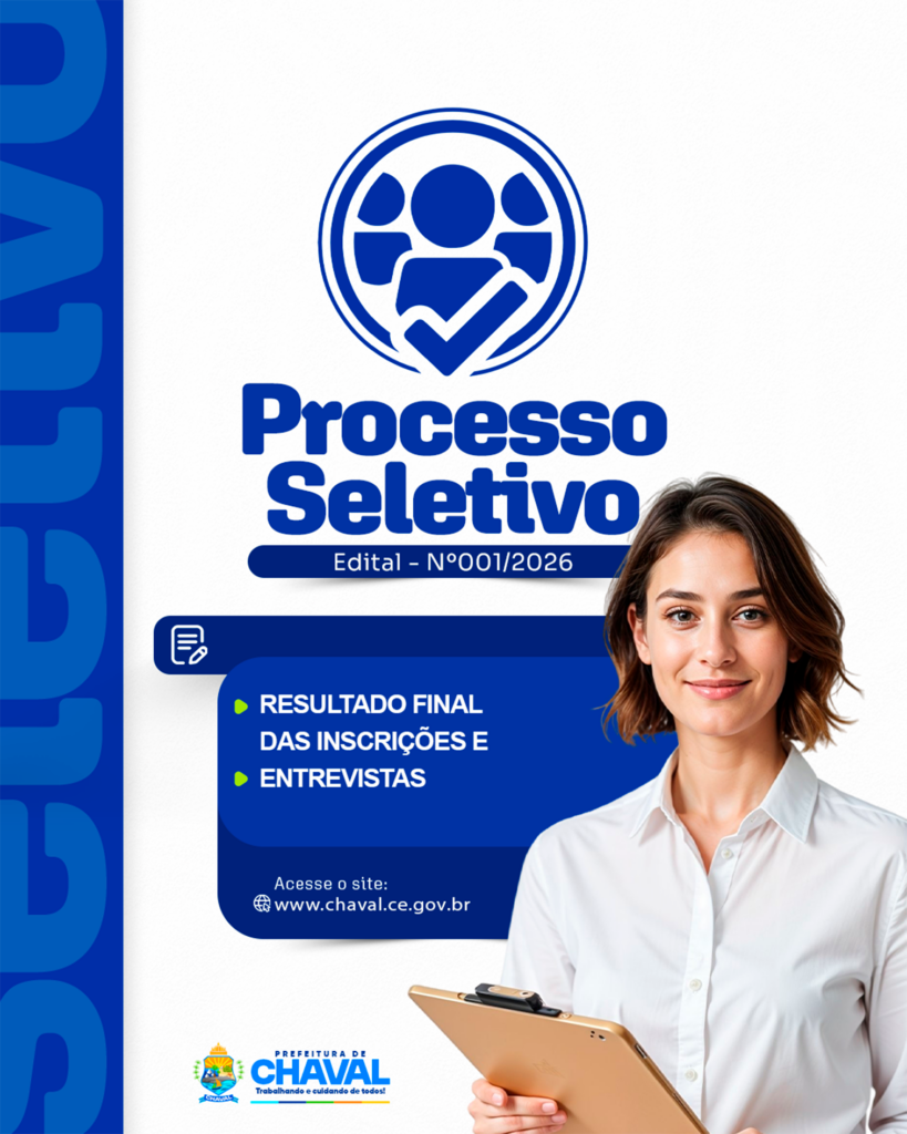 A Prefeitura Municipal de Chaval torna público o Resultado Final Definitivo do Processo Seletivo Simplificado nº 001/2026, destinado ao preenchimento de vagas em diversas secretarias municipais. O certame contemplou oportunidades para a: A seleção ocorreu por meio de análise curricular e entrevista, conforme critérios estabelecidos em edital. A lista completa com candidatos deferidos, indeferidos e desclassificados, bem como […]