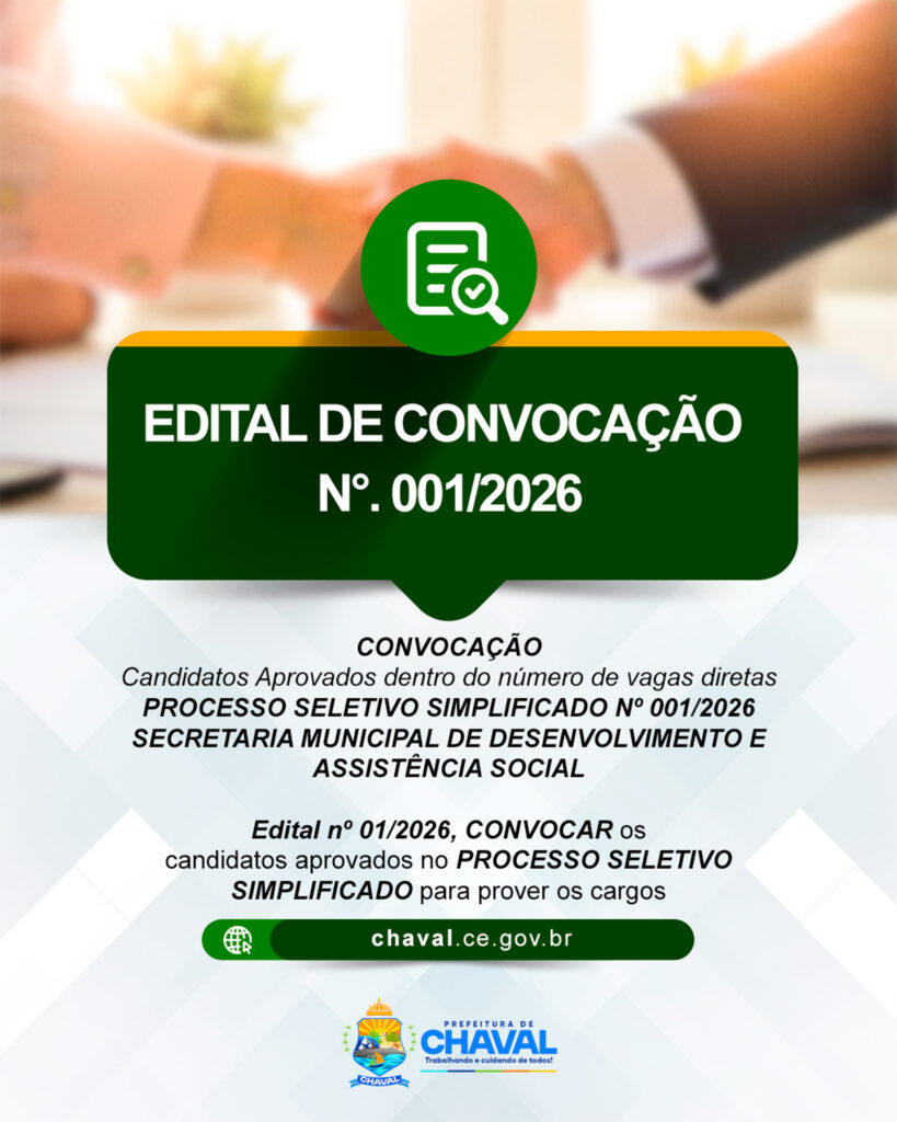 📢 EDITAL DE CONVOCAÇÃO Nº 001/2026 – SAÚDE A Prefeitura de Chaval convoca os candidatos aprovados dentro do número de vagas diretas do Processo Seletivo Simplificado nº 001/2026, da Secretaria Municipal de Saúde. Os convocados deverão observar as orientações descritas no edital para o devido provimento dos cargos. 📌 Consulte prazos, documentação necessária e demais informações no […]