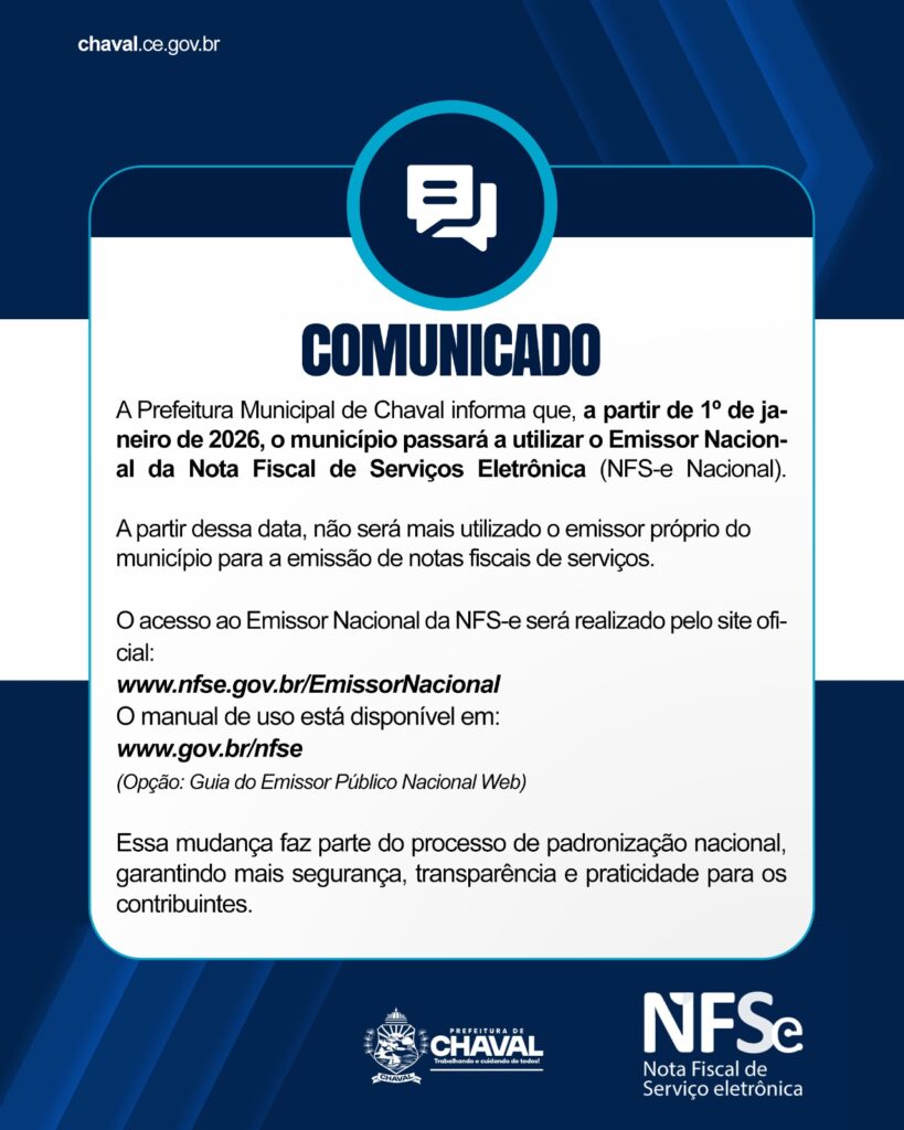 A Prefeitura Municipal de Chaval informa que, a partir de 1º de janeiro de 2026, o município passará a utilizar o Emissor Nacional da Nota Fiscal de Serviços Eletrônica (NFS-e Nacional). A partir dessa data, não será mais utilizado o emissor próprio do município para a emissão de notas fiscais de serviços. O acesso ao Emissor Nacional da NFS-e será realizado pelo site […]