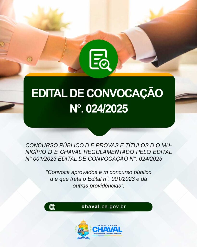 Prefeitura de Chaval divulga Edital de Convocação nº 024/2025 do Concurso Público regido pelo Edital nº 001/2023
