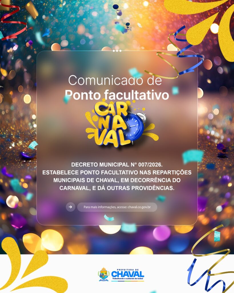 A Prefeitura Municipal de Chaval informa que, em decorrência do Carnaval, fica decretado ponto facultativo nas repartições municipais de 16 a 18 de fevereiro de 2026, com retorno do expediente às 13h30 do dia 18/02. ⚠️ Os serviços essenciais seguem funcionando em regime de plantão, como Hospital Municipal, limpeza pública, iluminação e vigilância. Prefeitura Municipal de ChavalTrabalhando […]