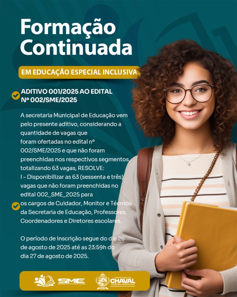 ADITIVO 001/2025 AO EDITAL Nº 002/SME/2025 A secretaria Municipal de Educação vem pelo presente aditivo, considerando a quantidade de vagas que foram ofertadas no edital nº 002/SME/2025 e que não foram preenchidas nos respectivos segmentos, totalizando 63 vagas, RESOLVE: I – Disponibilizar as 63 (sessenta e três) vagas que não foram preenchidas no edital 002_SME_2025 […]
