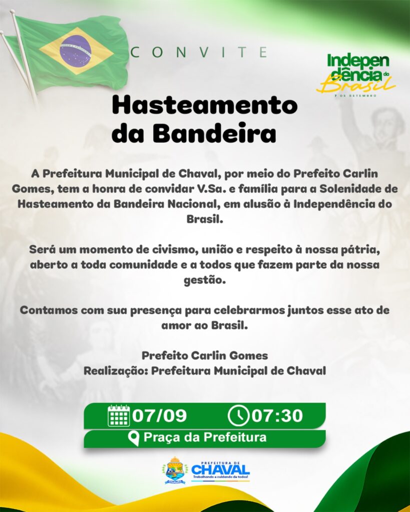 A Prefeitura Municipal de Chaval, por meio do Prefeito Carlin Gomes, tem a honra de convidar V.Sa. e família para a Solenidade de Hasteamento da Bandeira Nacional, em alusão à Independência do Brasil. Será um momento de civismo, união e respeito à nossa pátria, aberto a toda comunidade e a todos que fazem parte da nossa gestão. 📍 Local: […]