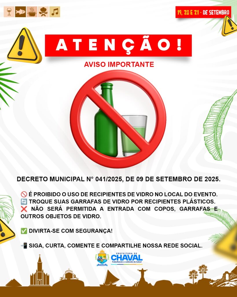 🚫 É proibido o uso de recipientes de vidro no local do evento.🔄 Troque suas garrafas de vidro por recipientes plásticos.❌ Não será permitida a entrada com copos, garrafas e outros objetos de vidro.✅ Divirta-se com segurança! 📲 Siga, curta, comente e compartilhe nossa rede social. Realização: Prefeitura Municipal de Chaval