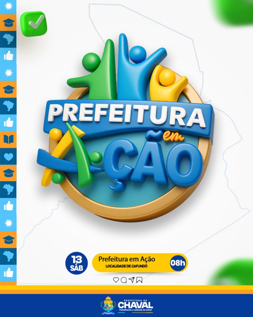 📅 Neste sábado, dia 13, a Prefeitura Municipal de Chaval leva mais serviços, saúde, lazer e cidadania para você e sua família! 👩⚕️ Saúde: 📚 Educação e Cultura: 🤝 Assistência Social: ✅ Uma manhã de serviços gratuitos e cuidados para toda a comunidade do Cafundó! 📍 Realização: Prefeitura Municipal de Chaval