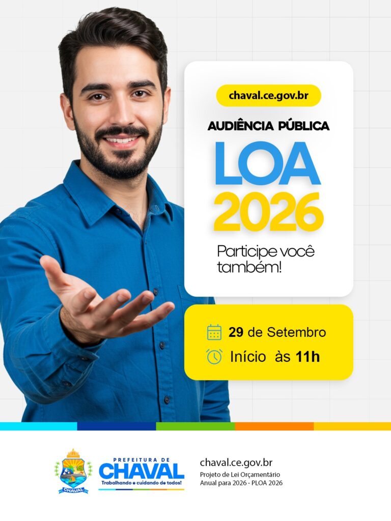 COMOCA AUDIÊNCIA PÚBLICA PARA ELABORAÇÃO DO PROJETO D E LEI ORÇAMENTÁRIA ANUAL PARA 2026 – PLOA 2026.O PREFEITO MUNICIPAL D E CHAVAL, Estado d o Ceará, no uso de suas atribuições legais, TORNA PUBLICO a quem interessar, pelo presente EDITAL, a convocação de AUDIÊNCIA PÚBLICA VIRTUAL concernente à discussão para a elaboração do Projeto de […]