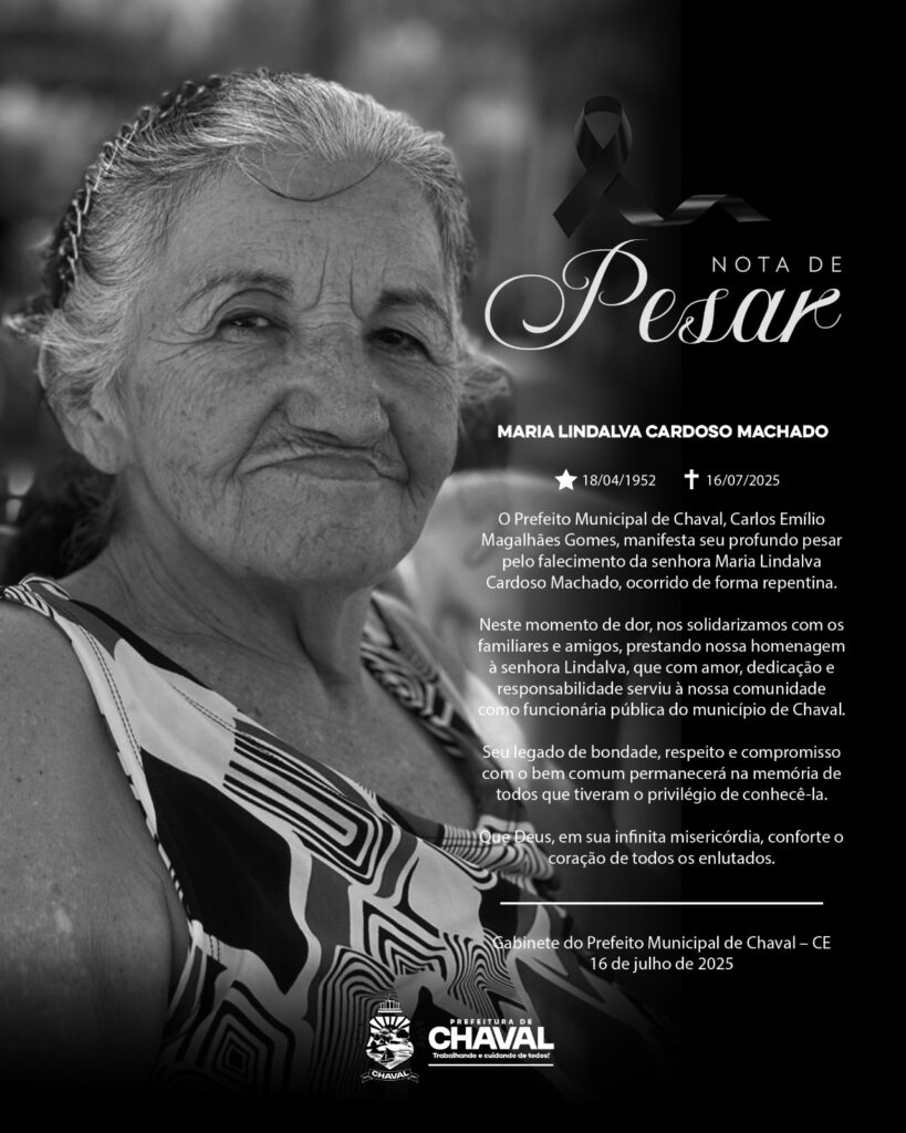 O Prefeito Municipal de Chaval, Carlos Emílio Magalhães Gomes, manifesta seu profundo pesar pelo falecimento da senhora Maria Lindalva Cardoso Machado, ocorrido de forma repentina. Neste momento de dor, nos solidarizamos com os familiares e amigos, prestando nossa homenagem à senhora Lindalva, que com amor, dedicação e responsabilidade serviu à nossa comunidade como funcionária pública do município de Chaval. Seu legado de bondade, […]