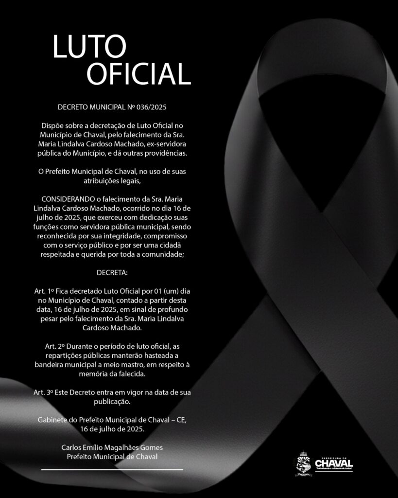 DECRETO MUNICIPAL Nº 036/2025Dispõe sobre a decretação de Luto Oficial no Município de Chaval, pelo falecimento da Sra. Maria Lindalva Cardoso Machado, ex-servidora pública do Município, e dá outras providências.O Prefeito Municipal de Chaval, no uso de suas atribuições legais,CONSIDERANDO o falecimento da Sra. Maria Lindalva Cardoso Machado, ocorrido no dia 16 de julho de […]