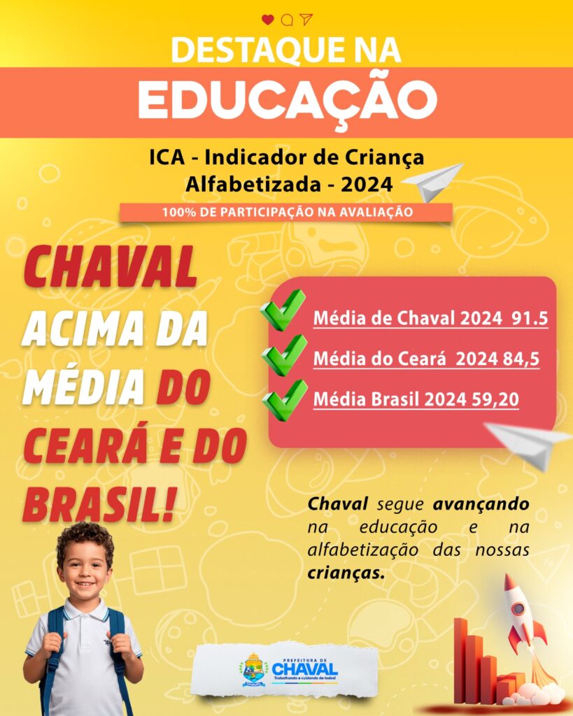 CHAVAL SE DESTACA NO PROGRAMA CRIANÇA ALFABETIZADA COM 100% DE PARTICIPAÇÃO E NÍVEL MÁXIMO É com grande satisfação que anunciamos que o município de Chaval alcançou um importante marco no Programa Criança Alfabetizada. Com 100% de participação na avaliação, Chaval atingiu o Nível 5, que representa o nível máximo de desempenho no programa. Desde a […]