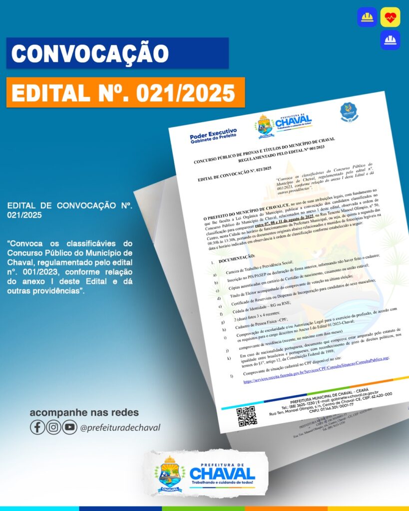 CONCURSO PÚBLICO DE PROVAS E TÍTULOS DO MUNICÍPIO DE CHAVAL REGULAMENTADO PELO EDITAL N° 001/2023 EDITAL DE CONVOCAÇÃO Nº. 021/2025 “Convoca os classificávies do Concurso Público do Município de Chaval, regulamentado pelo edital n°. 001/2023, conforme relação do anexo I deste Edital e dá outras providências”.