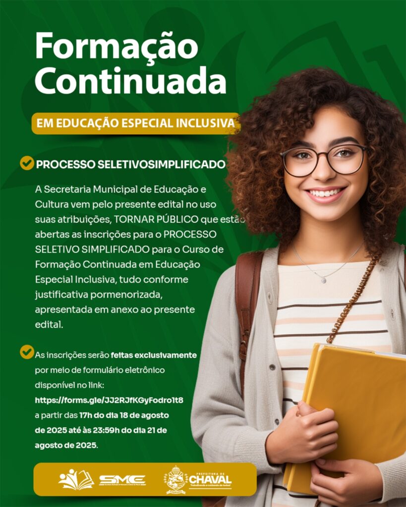 A Prefeitura de Chaval, por meio da Secretaria Municipal de Educação e Cultura, informa que estão abertas as inscrições para o Processo Seletivo Simplificado do Curso de Formação Continuada em Educação Especial Inclusiva. 👩🏫 Público-alvo: Professores, cuidadores, técnicos da SME e gestores escolares da rede municipal.⏳ Duração do curso: 12 meses🗓 Inscrições: de 18/08 (17h) até 21/08 (23h59)📌 Inscrição online: clique aqui ⚠️ Critérios de prioridade:1️⃣ Profissionais […]