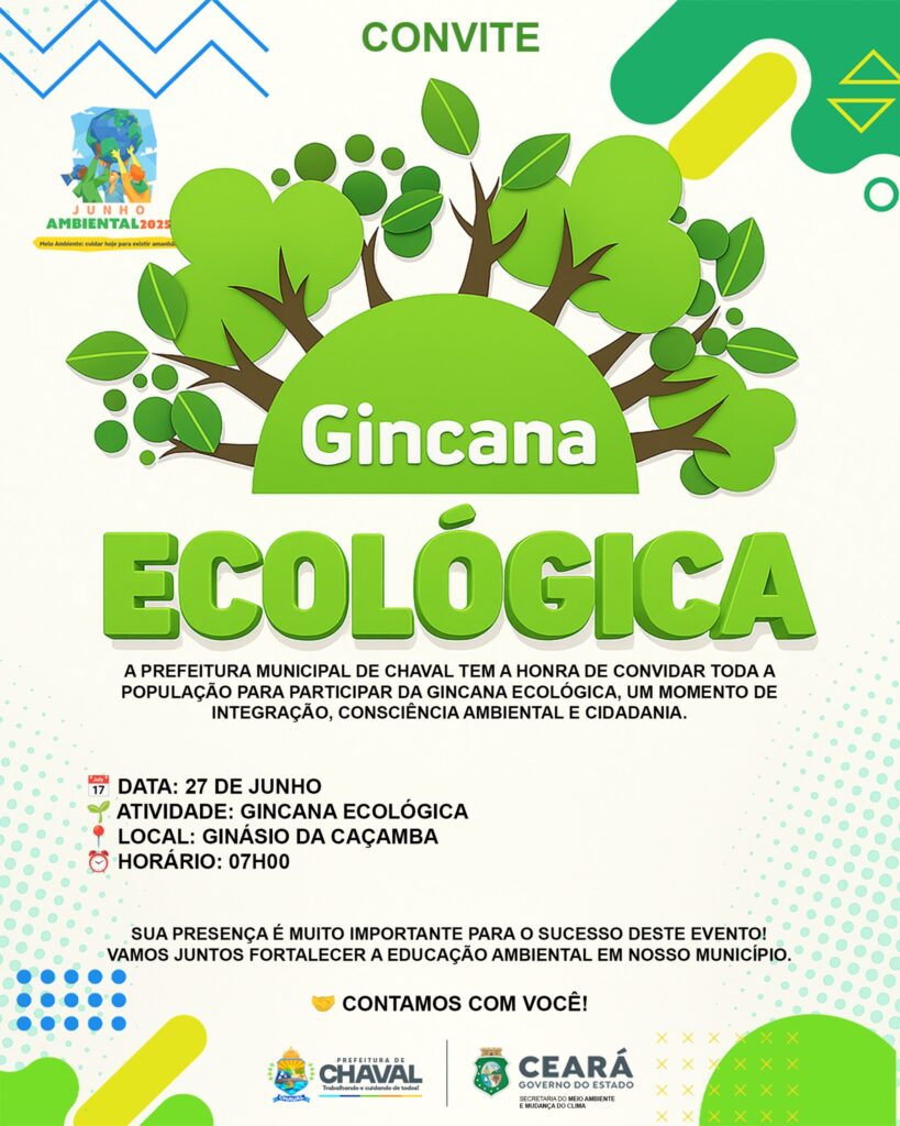 GINCANA ECOLÓGICA A Prefeitura Municipal de Chaval tem a honra de convidar toda a população para um momento de integração, consciência ambiental e cidadania! Data: 27 de junho (quinta-feira) Atividade: Gincana Ecológica Local: Ginásio da Caçamba Horário: 07h00 Sua presença é fundamental para o sucesso deste evento! Vamos juntos fortalecer a educação ambiental no nosso […]