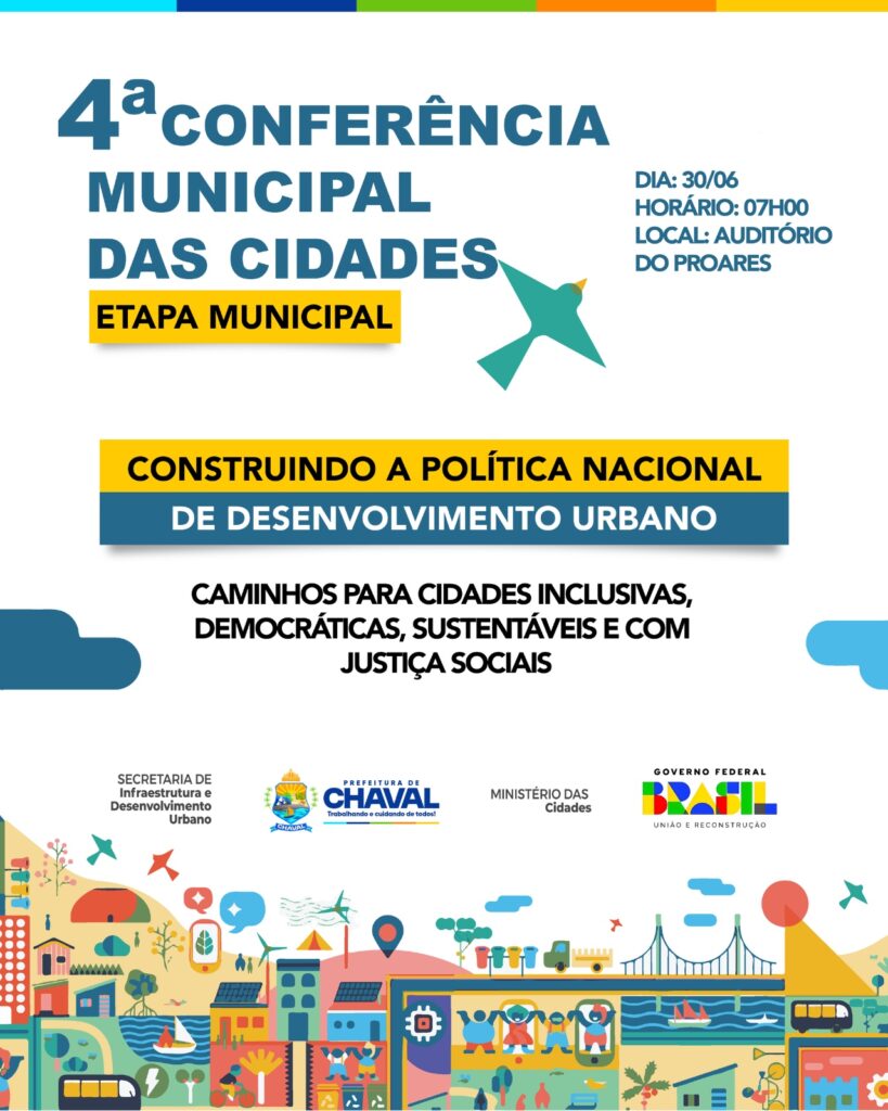 🎉 Vem aí!A 4ª CONFERÊNCIA MUNICIPAL DAS CIDADES – Etapa Municipal em Chaval 📍 Local: Auditório do PROARES📅 Data: 30 de junho🕗 Horário: 08h00 Você é nosso convidado para fazer parte deste importante momento de diálogo e construção coletiva!Vamos juntos debater e propor soluções para o futuro da nossa cidade! 🌱 Tema:Construindo a Política Nacional de Desenvolvimento Urbano🧭 Caminhos para cidades inclusivas, democráticas, sustentáveis e com justiças sociais. ✅ Confirme sua participação […]