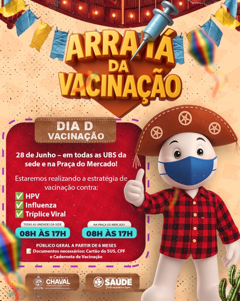 🎉 DIA D DA VACINAÇÃO 🎉28 de Junho – em todas as UBS da sede e na Praça do Mercado! 💉 Estaremos realizando a estratégia de vacinação contra:✅ HPV✅ Influenza✅ Tríplice Viral 👤 Público-alvo: Adolescentes e adultos📝 Documentos necessários: Cartão do SUS, CPF e Caderneta de Vacinação 🌽 Não deixe pra depois!Venha de xote, venha de chapéu,mas o mais importante: venha se vacinar! 🎯 Vacinas salvam vidas. Participe!Prefeitura Municipal de Chaval