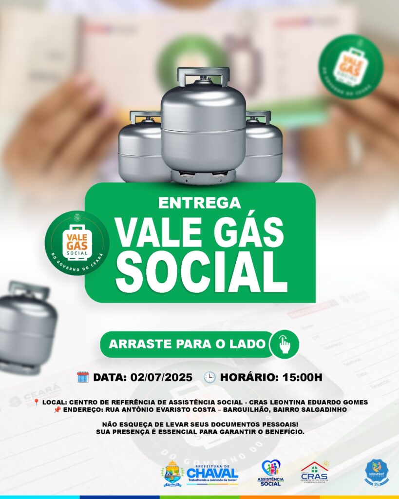 📢 Atenção, população de Chaval! A Prefeitura Municipal de Chaval divulga a lista oficial das famílias beneficiadas pelo Vale Gás Social! ⠀ 📦 Data da entrega: 02/07/2025 🕒 Horário: 15:00h 📍 Local: Centro de Referência de Assistência Social – CRAS Leontina Eduardo Gomes 📌 Rua Antônio Evaristo Costa – Barguilhão, Bairro Salgadinho 📄 Confira a […]