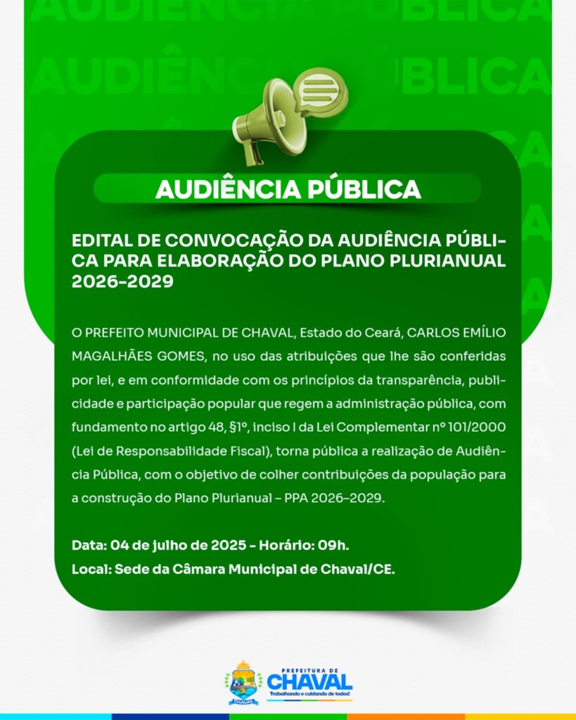 📢 EDITAL DE CONVOCAÇÃO – AUDIÊNCIA PÚBLICA A Prefeitura Municipal de Chaval, por meio do prefeito Carlos Emílio Magalhães Gomes, convida toda a população para participar da Audiência Pública de elaboração do Plano Plurianual (PPA) 2026–2029. Esse é um momento importante para que você possa contribuir com ideias e propostas para o futuro do nosso município! 🗓 Data: 04 de julho de 2025🕘 Horário: 09h📍 Local: Sede […]