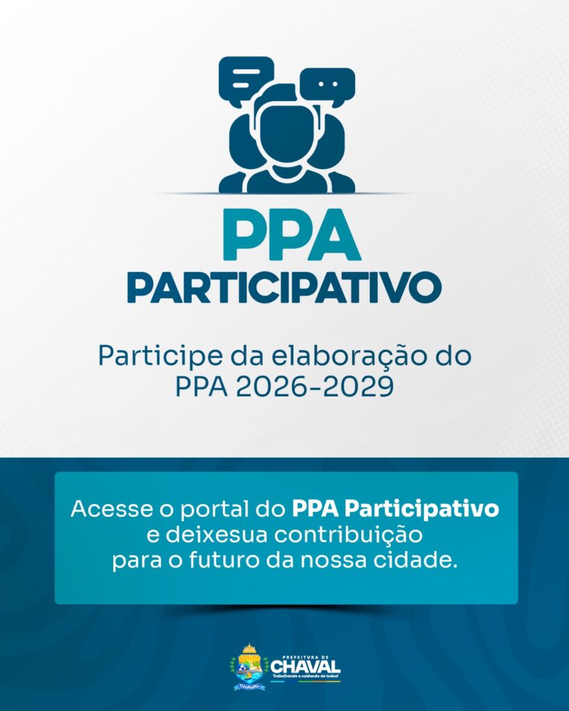 Participação Social na Elaboração do PPA 2026-2029 Sua Voz Constrói o Futuro de Chaval!O Plano Plurianual (PPA) é a ferramenta que define as prioridades, metas e investimentos do município para os próximos quatro anos (2026-2029). Nele, são planejadas ações essenciais como saúde, educação, infraestrutura, cultura e desenvolvimento econômico.Mas um PPA verdadeiramente eficaz só existe com […]