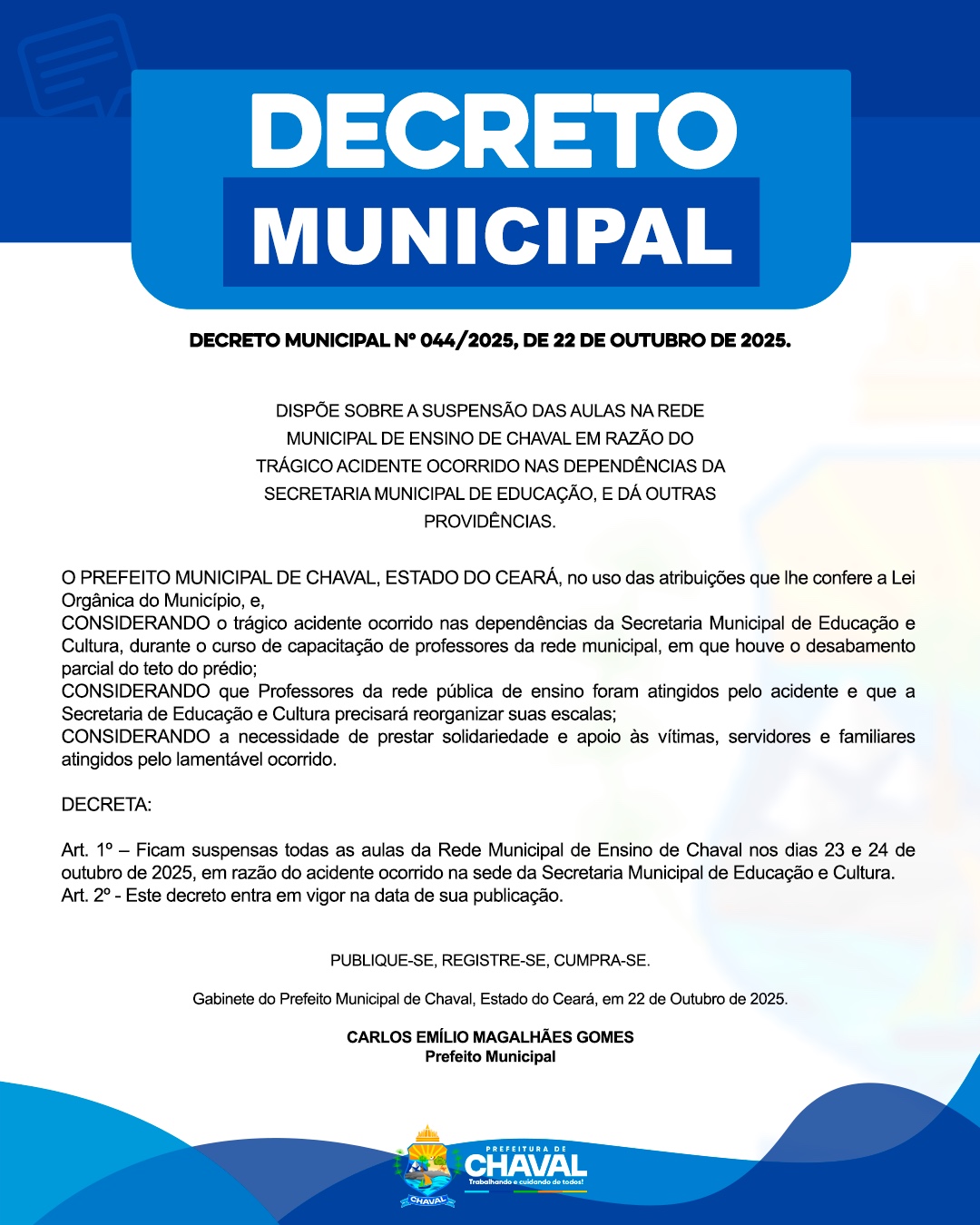 Prefeitura de Chaval decreta feriado municipal e ponto facultativo nos dias 27 e 28 de novembro 6 de novembro de 2025 Leis mais »