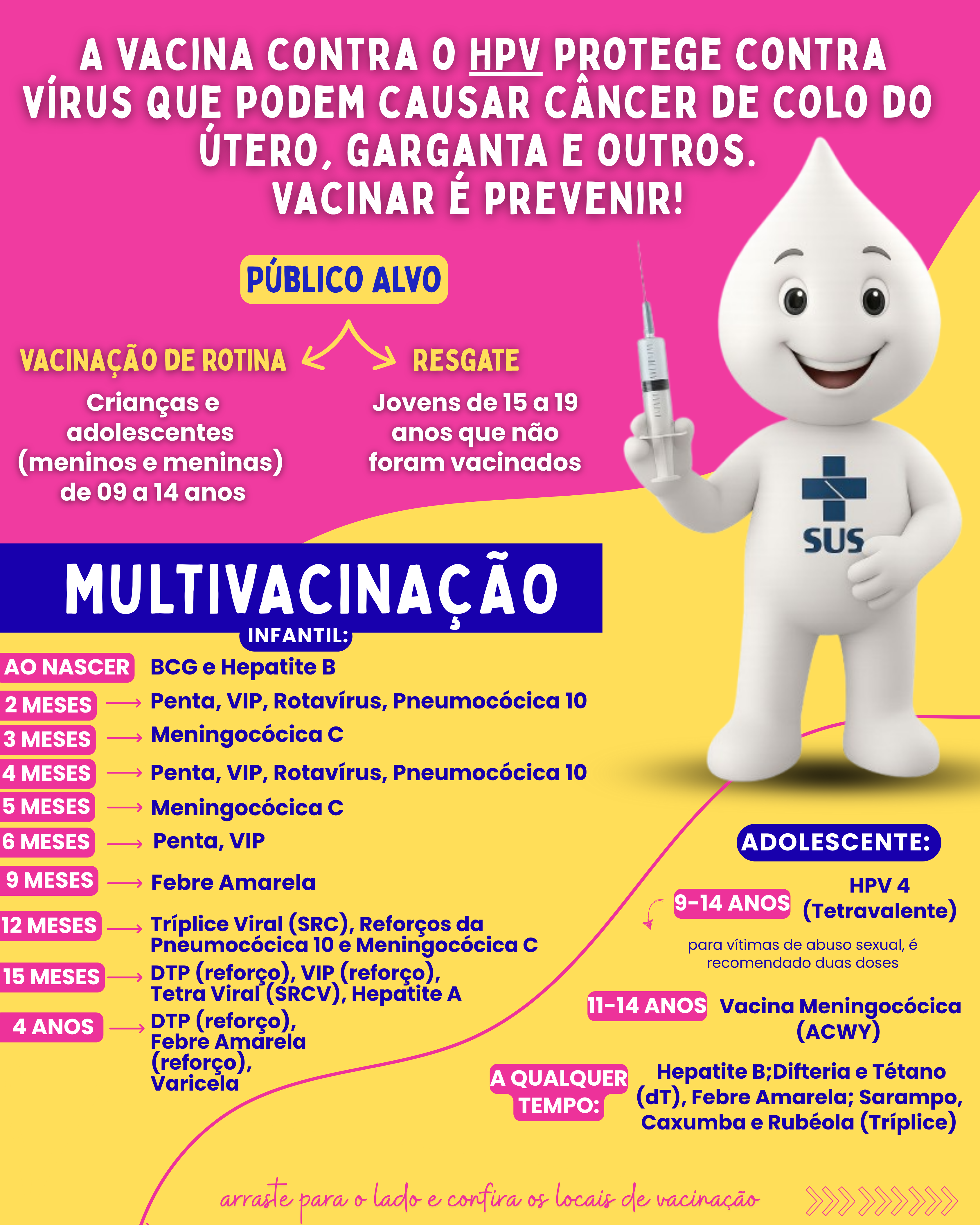 Não esqueça de levar a caderneta de vacinação, seu Cartão do SUS ou CPF.